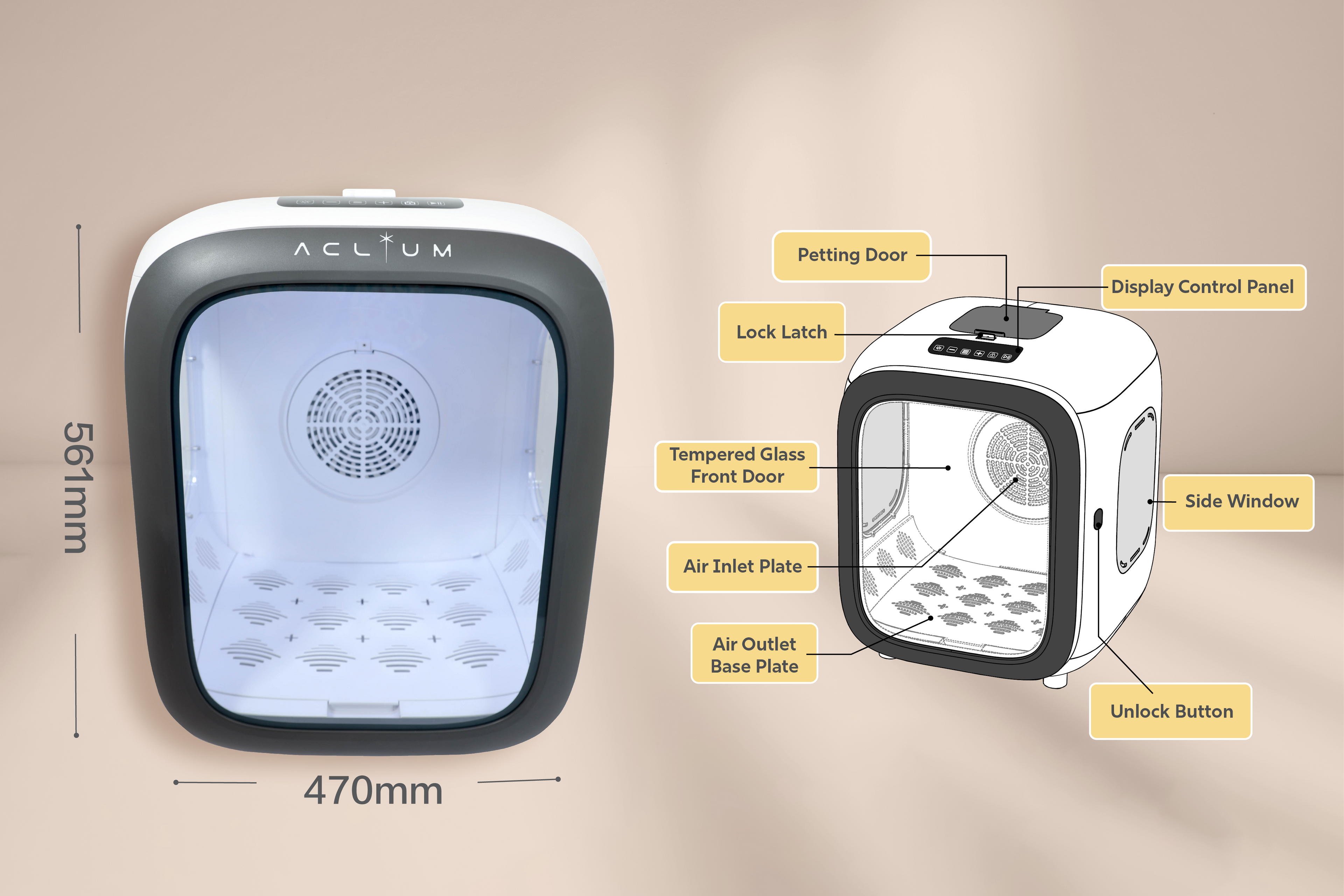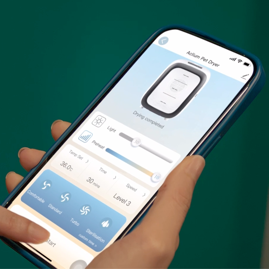 Powerful airflow from the bottom accommodates your pet's position and ensures even coverage, reducing drying time. Customise temperature, heat intensity, blowing speed, and drying duration with the intuitive control panel.